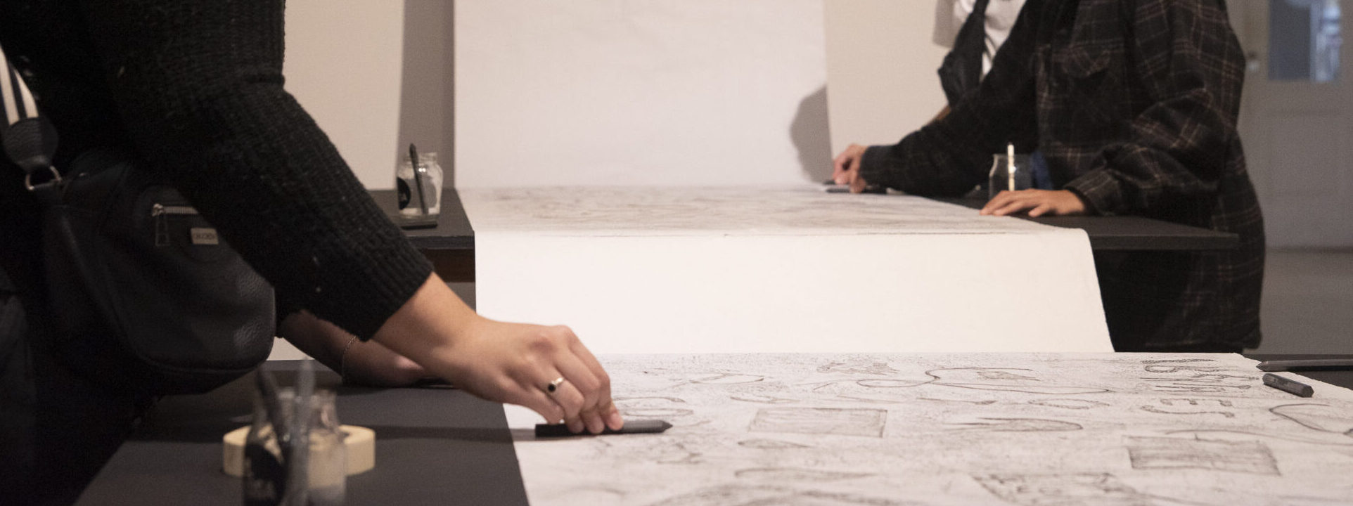 La propuesta tienen como protagonista el dispositivo «Grabar continuamente» un soporte continuo (rollo de papel sulfito) para aplicar la técnica de frottage, logrando revelar la textura de objetos, tramas y superficies que permitan la reflexión sobre el quehacer colectivo y la mirada atenta que plasma Kollwitz en su obra.