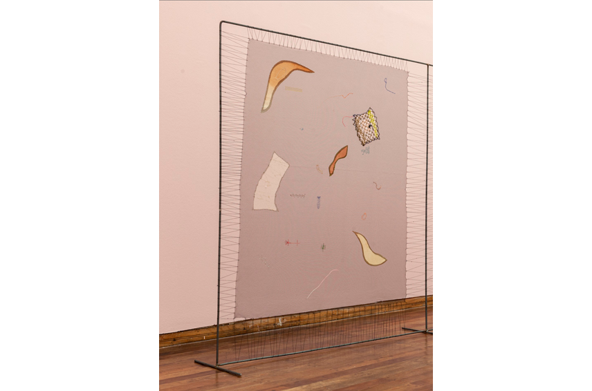 Billoné con tejidos y bordados, tensado en estructura de hierro