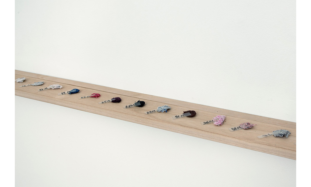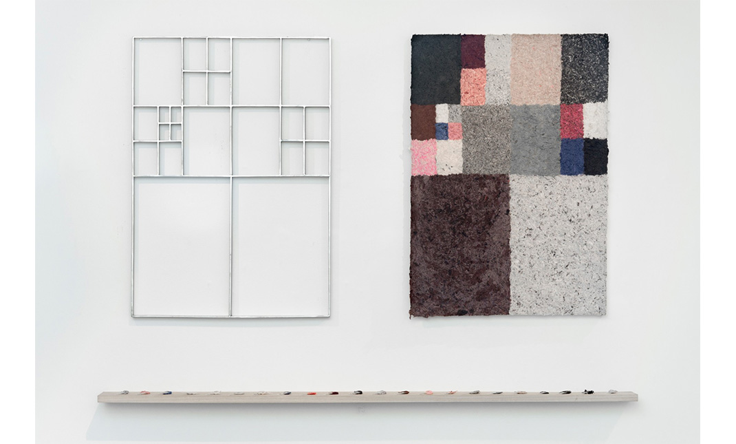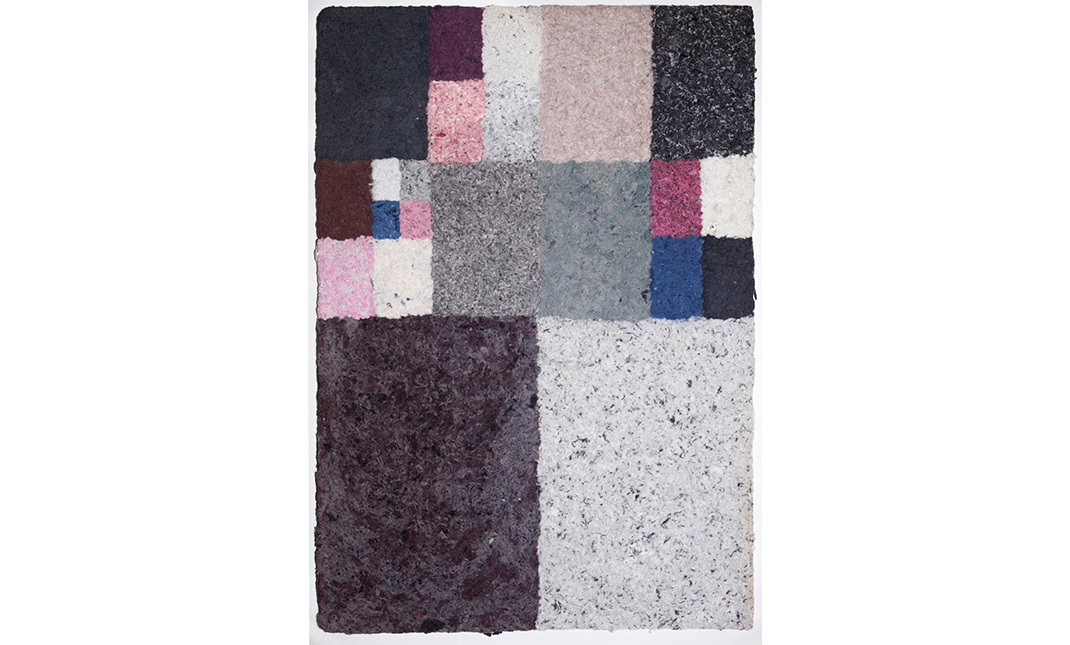 Con una técnica de armado de papel artesanal, transformo las medias perdidas en composiciones abstractas siguiendo algunos tamaños –A3, A5, A7 y A9– de la escala estandarizada ISO 216. Cada composición es una Media hoja: el resultado de un encuentro entre medias de diferentes lavanderías, tamaños y colores; encuentro que responde a la contingencia de la recolección, de su ritmo y posibilidad. Junto con su molde y las muestras de color, esta obra se constituye como una correspondencia de su ciclo de producción.