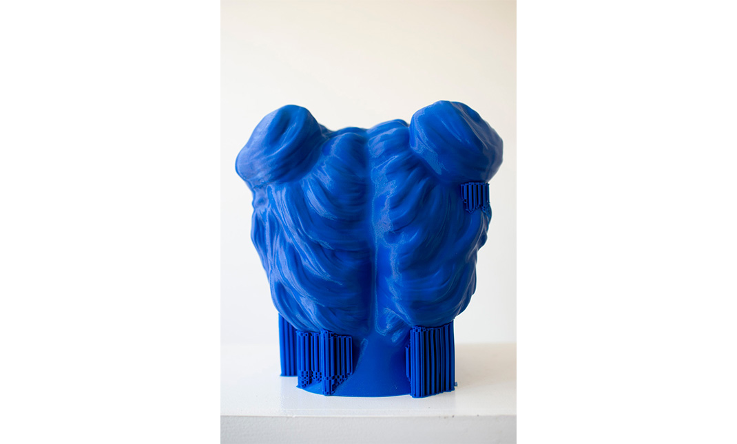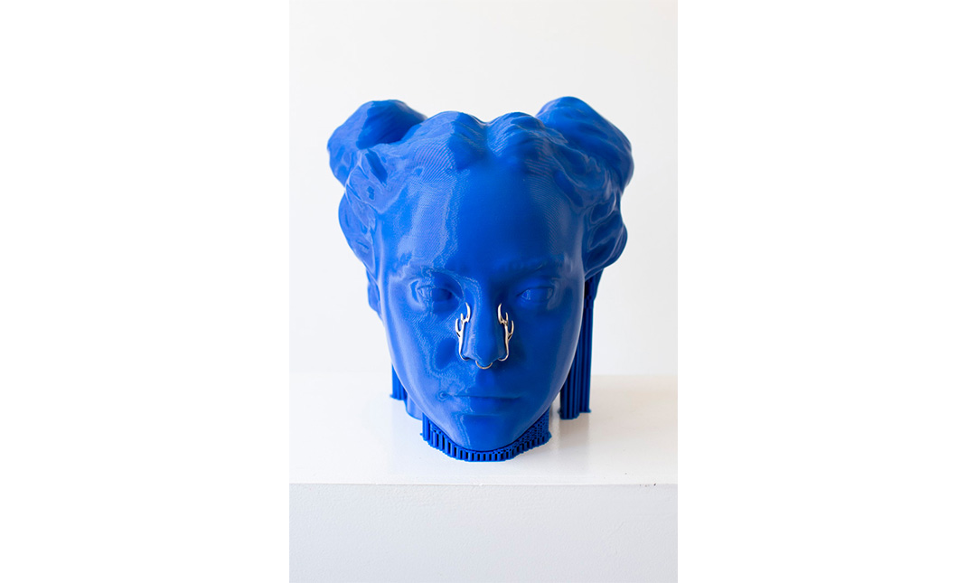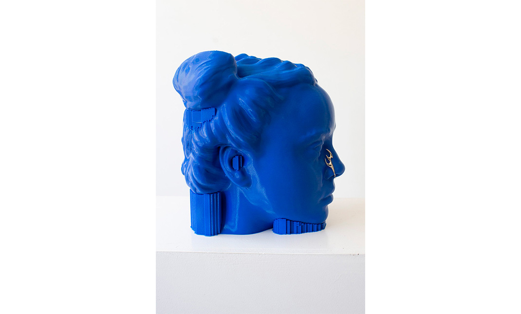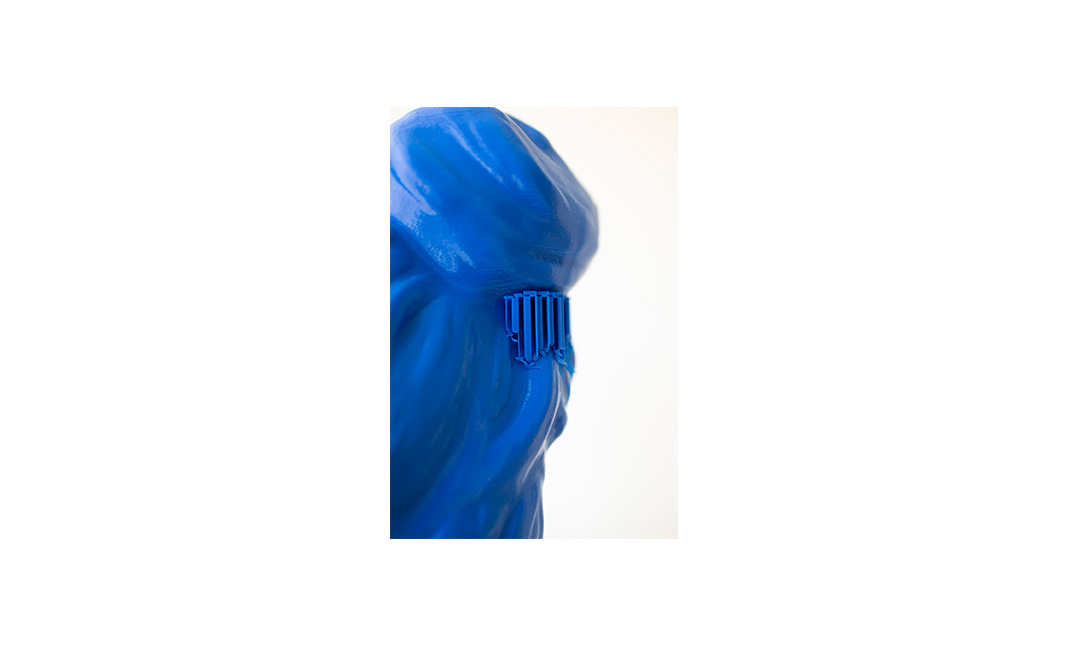 El mismo proceso de construcción propone un híbrido digital-analógico: escaneo (múltiples fotos por segundo de mi rostro) que modelo y esculpo en un software, para materializarlo en una impresora termoplástica. La obra se conserva cruda, sin postproceso. Así, se evidencia la presencia de la máquina robótica en su textura y en los soportes que la sostienen, incorporando un nuevo contraste orgánico-mecánico.